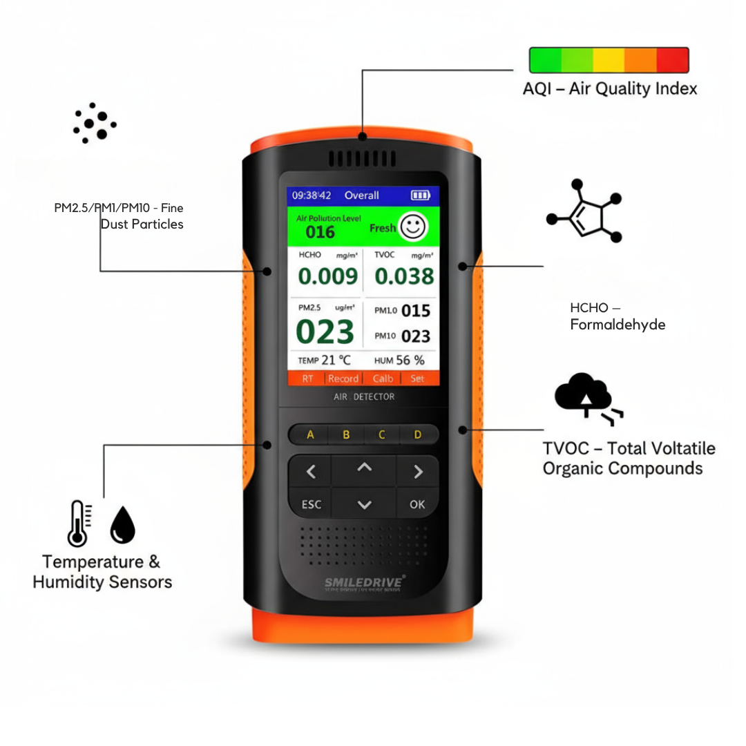 ✅ Comprehensive Air Quality Detection – Measures HCHO (Formaldehyde), TVOC (Volatile Organic Compounds), PM1.0, PM2.5, PM10, plus Temperature & Humidity in one device.