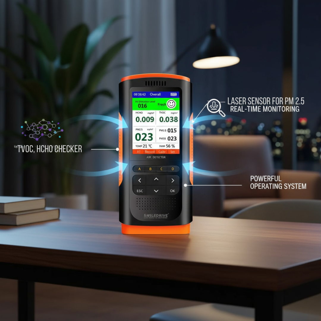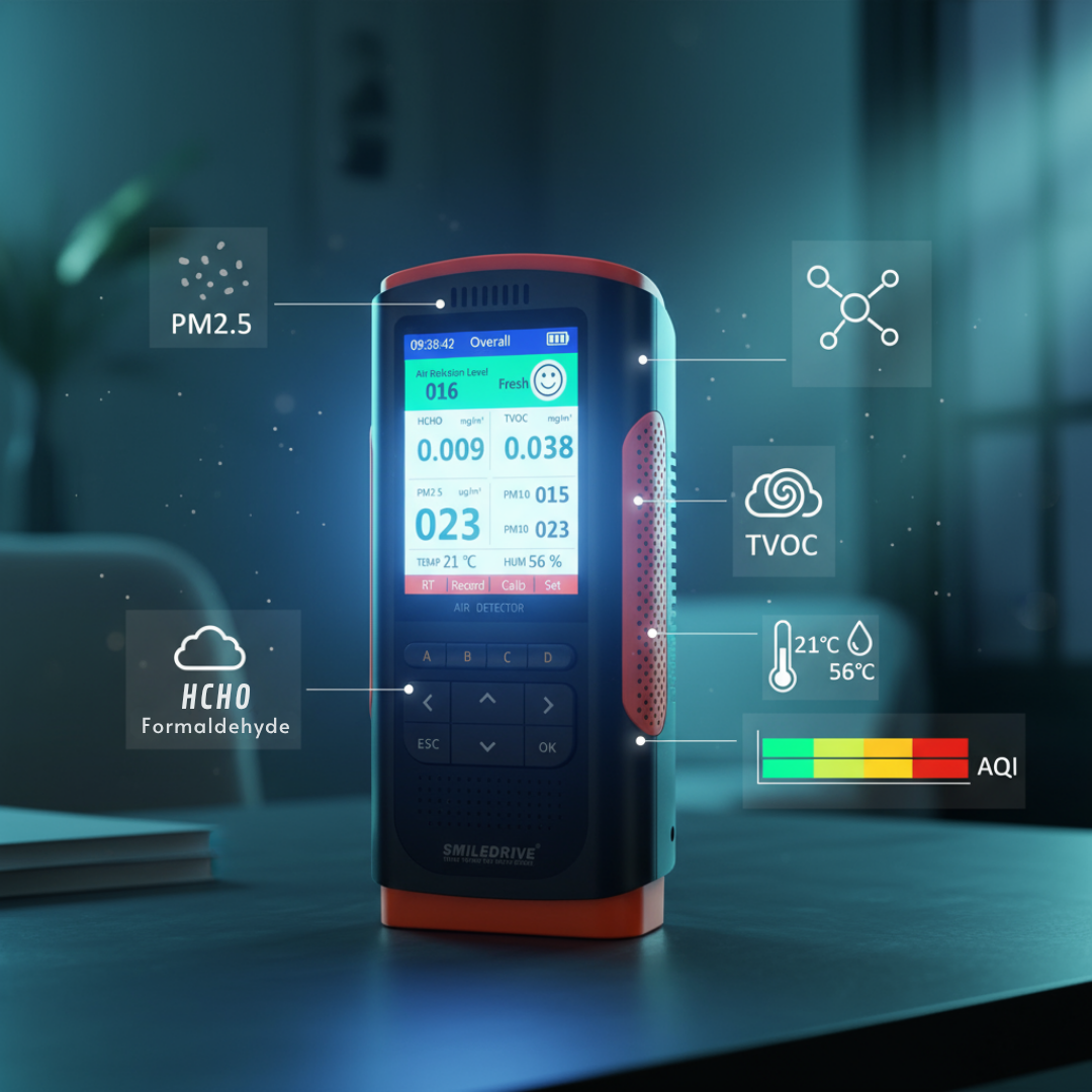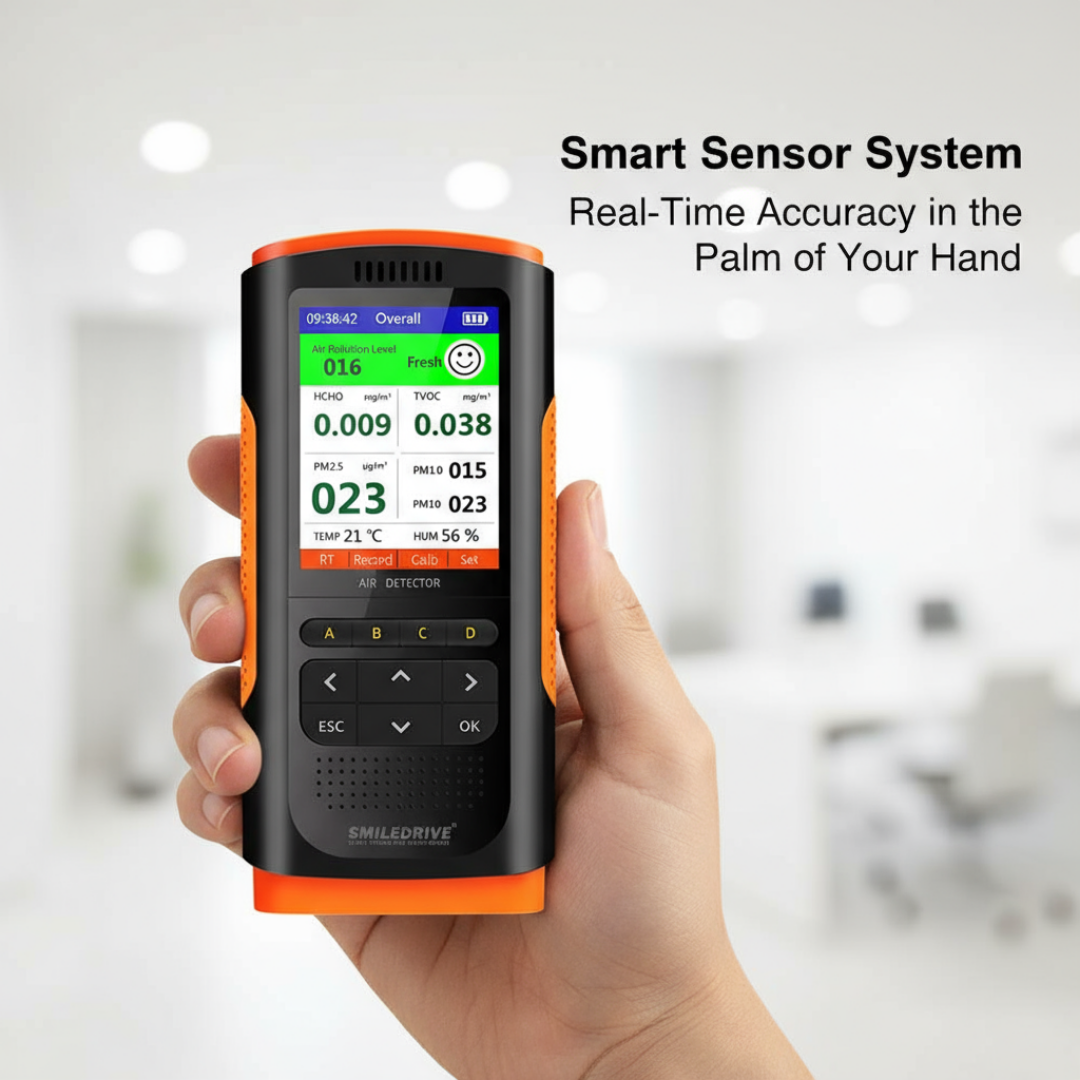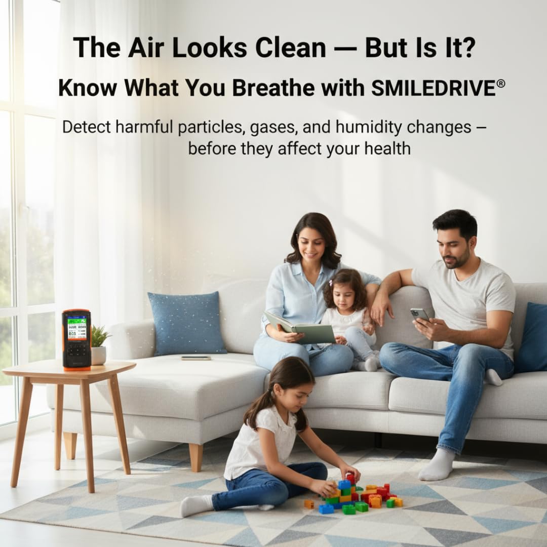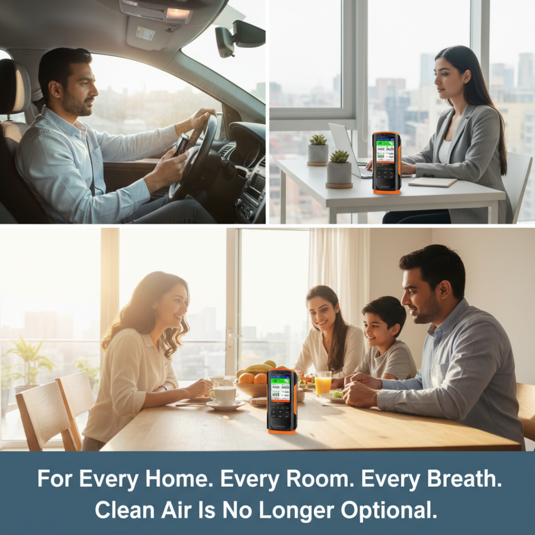 Designed for home, office, car, and everyday environments, providing essential air-quality visibility through a portable, rechargeable system that supports healthier living and confident environmental awareness.