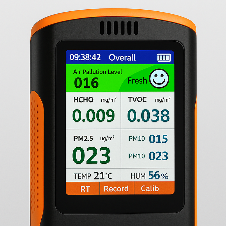 High-sensitivity sensors capture TVOC and HCHO levels with consistent reliability, presenting critical gas concentrations through a structured digital interface that enhances clarity in indoor air diagnostics.