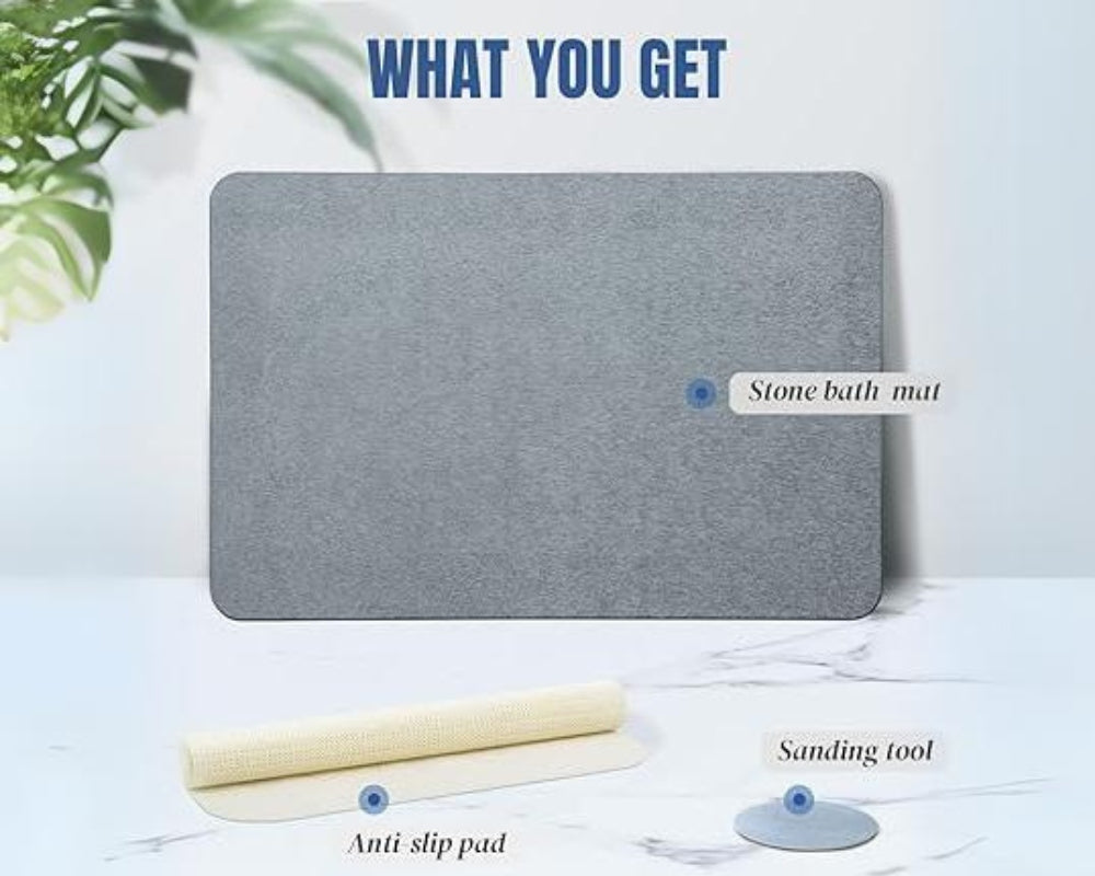 Smiledrive® Stone Bath Mat offers ultra-fast drying with its diatomaceous earth composition, absorbing moisture in seconds to keep your bathroom clean and dry. Designed for safety and comfort, it features a textured, anti-slip surface and rounded corners to protect your feet. Eco-friendly and easy to maintain, simply rinse under water and use sandpaper to restore its smooth surface. With a sleek, minimalist design in dark gray (23.5"x15.5"), this mat is perfect for bathrooms and kitchens alike. Enjoy a natural, safe, and stylish solution to traditional bath mats, making your space effortlessly elegant and functional.