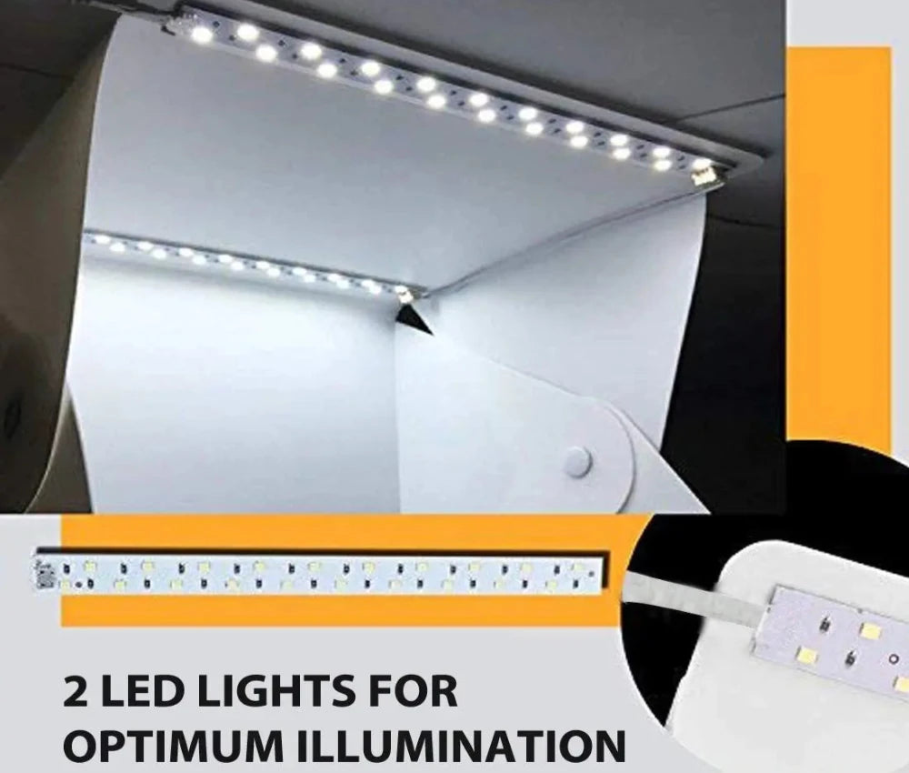 BUILT-IN 2 LED LIGHTS: Comes with fixed built-in 2 strips of LED lights. Total 70 LED beads in two strips (35 beads in one) provide optimal light for high-quality product shoots. Powered by a Micro-USB charging cable and a 2AMP USB Adapter(included).