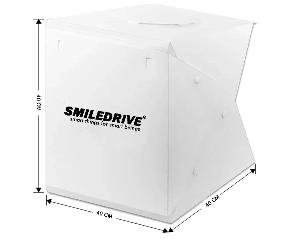SMILEDRIVE® Mini Portable Photo Light Box is ideal for photography of small to medium-sized products. You can shoot shoes, caps, toys, food, mobiles & mobile accessories, speakers, earphones, jewelry, etc. with ease. Shoot the product from various angles, thanks to the top slot and front open design. This 40x40x40 portable Studio Booth comes with 2 fixed LED lights, providing optimal illumination for perfect product shots. Easy to fold and comes with a carry/storage bag.