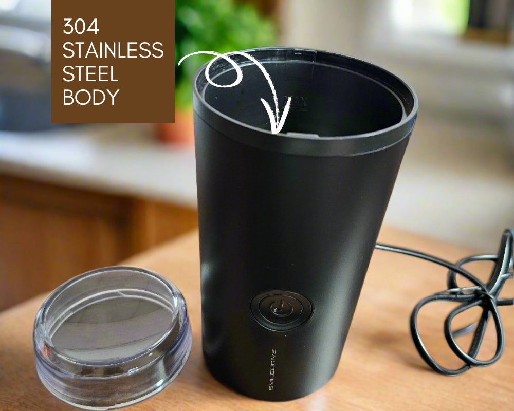 Crafted with high-quality internal stainless steel, the Smiledrive Coffee Grinder ensures durability, easy cleaning, and optimal grinding performance for coffee and spices.
