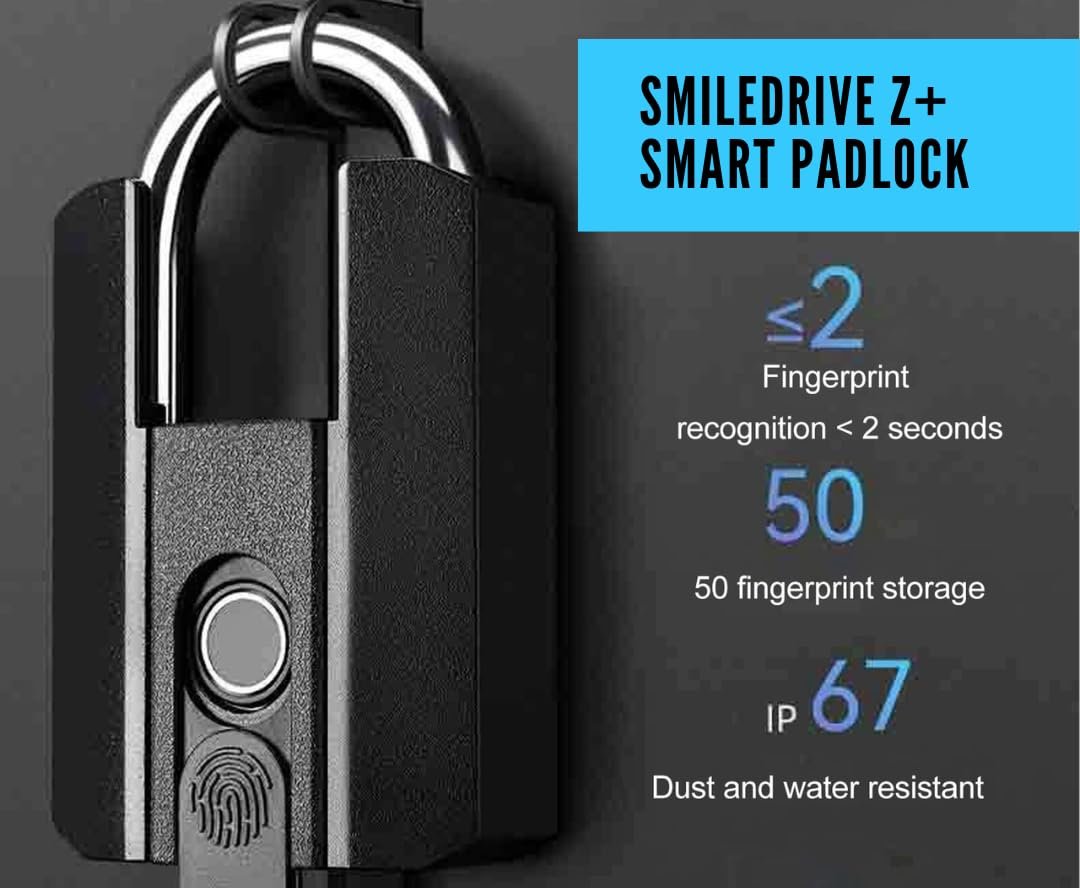 Smiledrive Z+ padlock is fast, smart and heavy-duty. Unlocks in under 2 seconds, stores up to 50 unique fingerprints and comes with best-in-the-industry IP67 protection