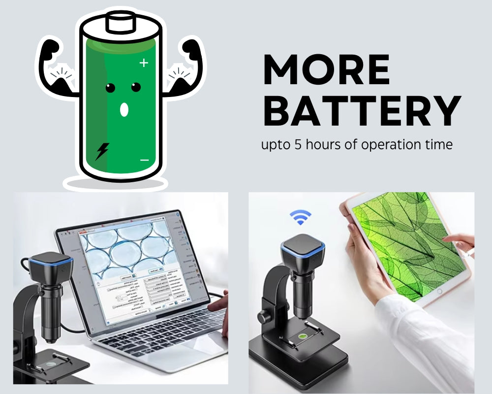 Advanced digital microscope featuring dual lenses, WiFi connectivity and USB compatibility for seamless use across Android, iOS and PCs in medical, industrial, and office environments