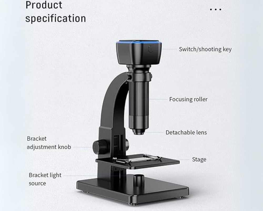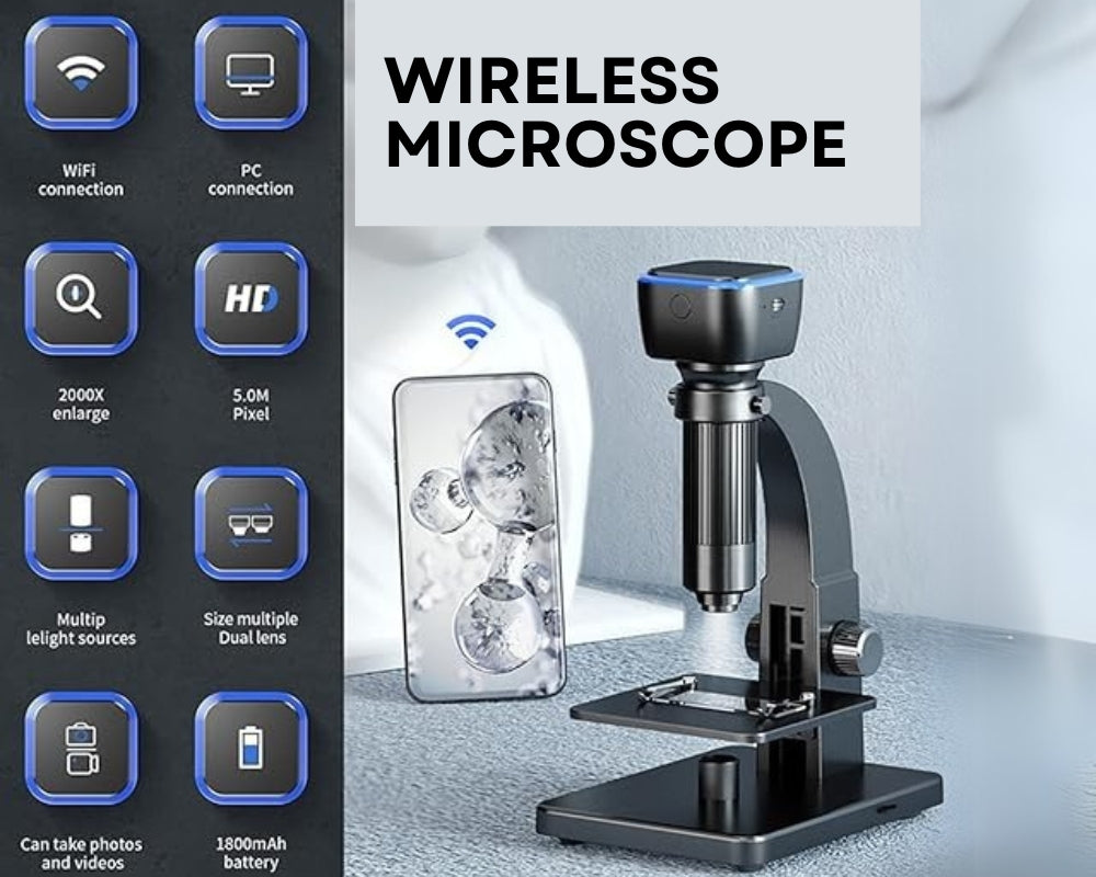 Explore the unseen with this High-Resolution WiFi Digital Microscope featuring dual lenses for 50x–500x and 50x–2000x magnification. Perfect for jewelry, PCB inspection, biological slides, and more, it offers HD clarity with 5MP resolution and 11 adjustable LEDs for bright, detailed viewing. Portable and wireless, it connects to PC, Android, and iOS devices, powered by a built-in 1800mAh rechargeable battery for up to 5 hours of use.