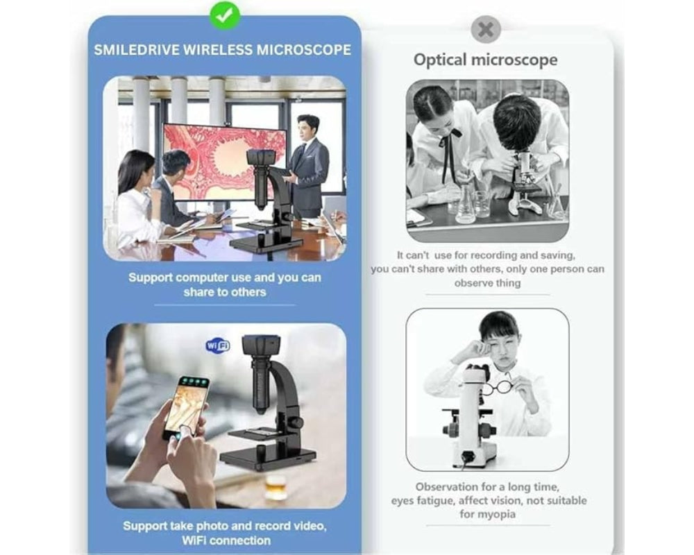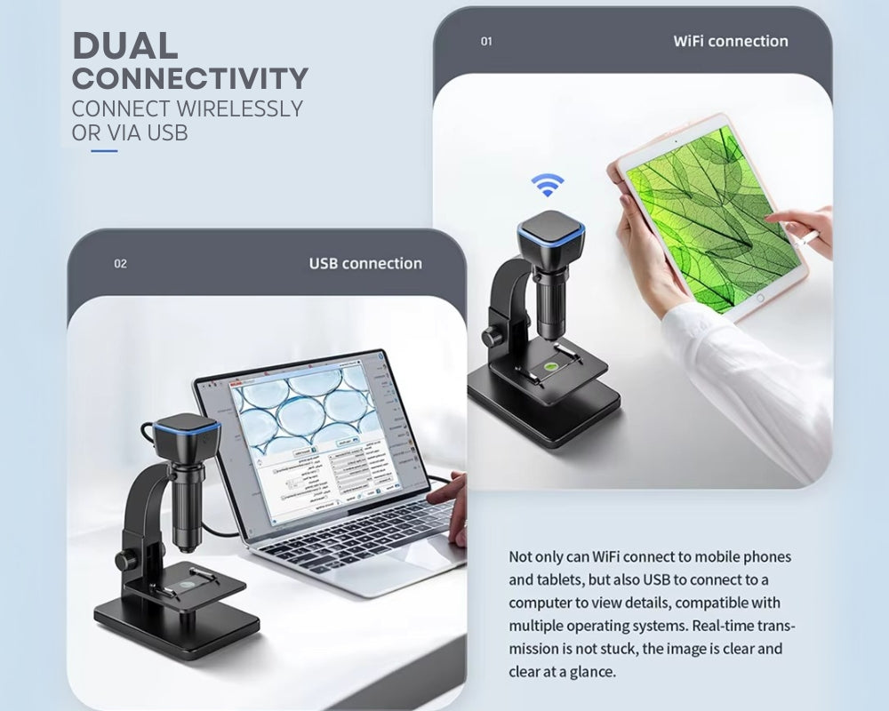 Microscope with WiFi and USB compatibility for real-time viewing on mobile devices and PCs, ideal for professional and educational use