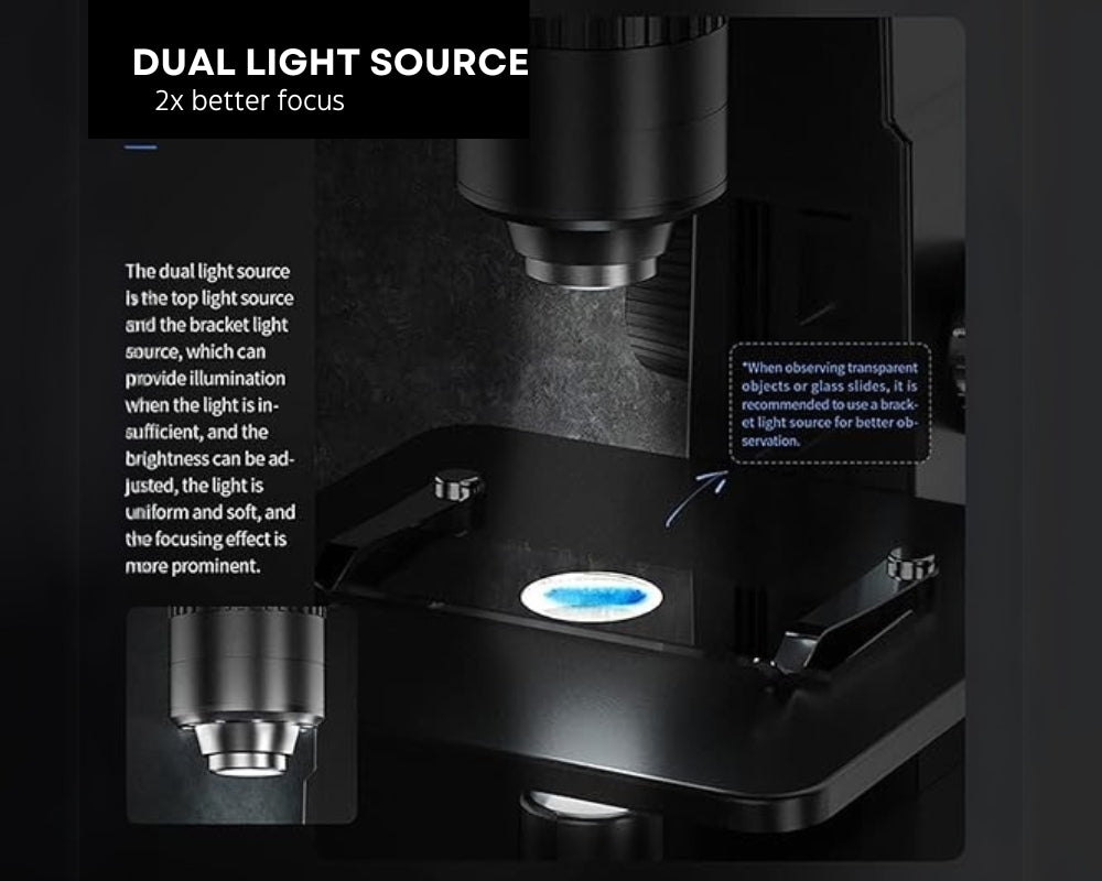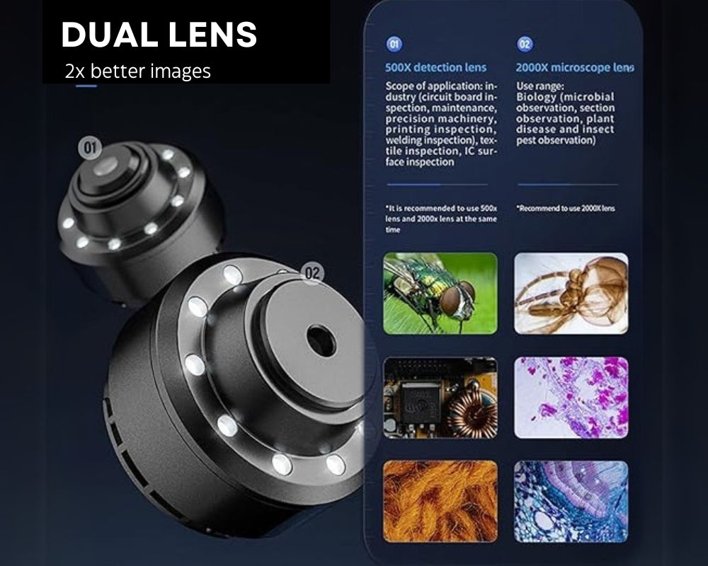 Dual-lens microscope with 500X and 2000X magnification for industrial, biological, and precision inspections.